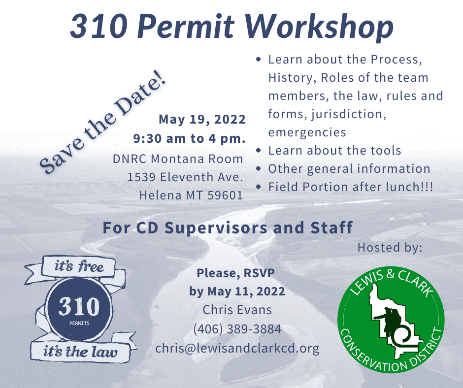 310 Permitting Workshop for CD Staff and Supervisors. Please RSVP by May 11 to Chris Evans. Phone: 406-389-3884 | Email: chris@lewisandclarkcd.org