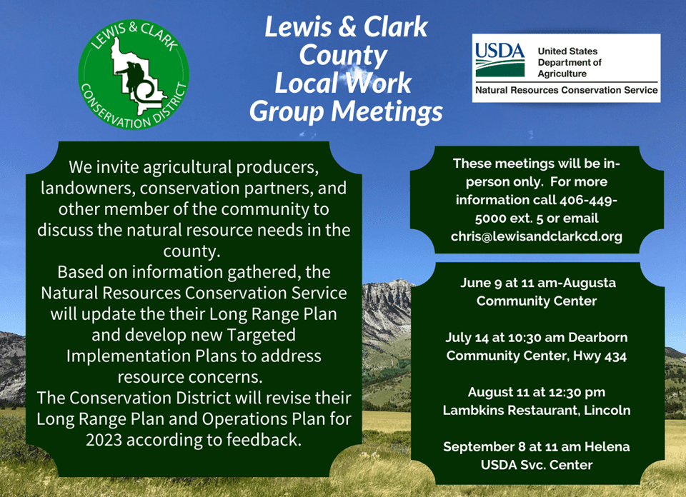 Lewis and Clark CD Local Work Group Meetings | Jul 14 @ 10:30am We invite agricultural producers, landowners, conservation partners, and other member of the community to discuss the natural resource needs in the county. Based on information gathered, theNatural Resources Conservation Service will update the their Long Range Plan and develop new Targeted Implementation…