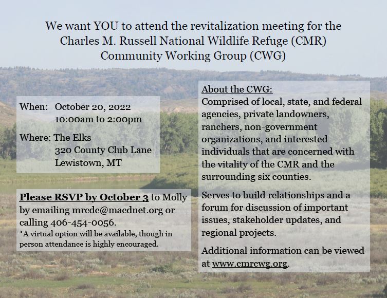 The Charles M. Russell National Wildlife Refuge Community Working Group (CMR CWG) was formed to enhance and preserve the ecological, economic, and social well-being of the 6 counties (Fergus, Garfield,…